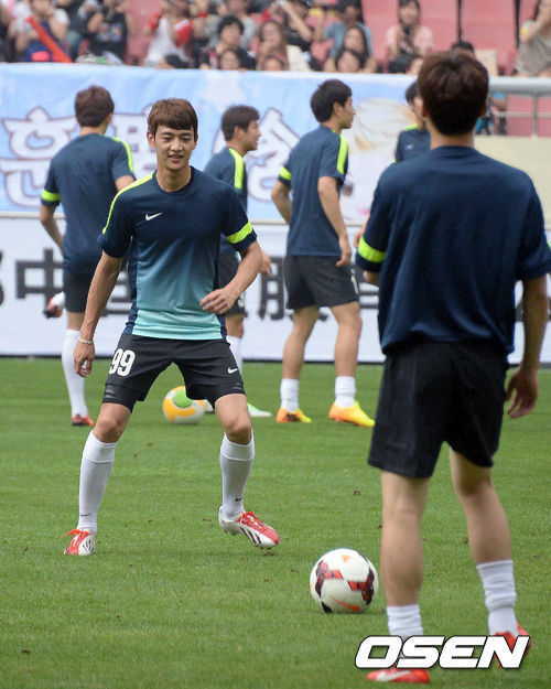경기에 앞서 샤이니 민호가 박지성과 패스 훈련을 하고 있다. /spjj@osen.co.kr