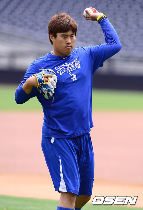 24일 새벽(한국시간) 미국 캘리포니아 샌디에이고 펫코파크에서 메이저리그 샌디에이고 파드리스와 LA 다저스의 경기에 앞서 류현진이 캐치볼을 하고 있다