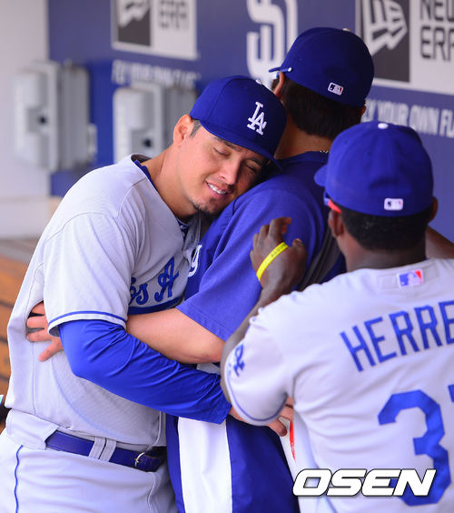 24일 새벽(한국시간) 미국 캘리포니아 샌디에이고 펫코파크에서 메이저리그 샌디에이고 파드리스와 LA 다저스의 경기에 앞서 다저스 크루스가 류현진과 포옹을 하고 있다