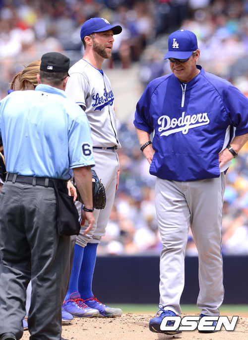 24일 새벽(한국시간) 미국 캘리포니아 샌디에이고 펫코파크에서 메이저리그 샌디에이고 파드리스와 LA 다저스의 경기, 3회말 샌디에이고 디노피아의 안타때 방망이에 맞은 LA 카푸아노 선발투수가 허니컷 투수 코치와 이야기를 나누고 있다