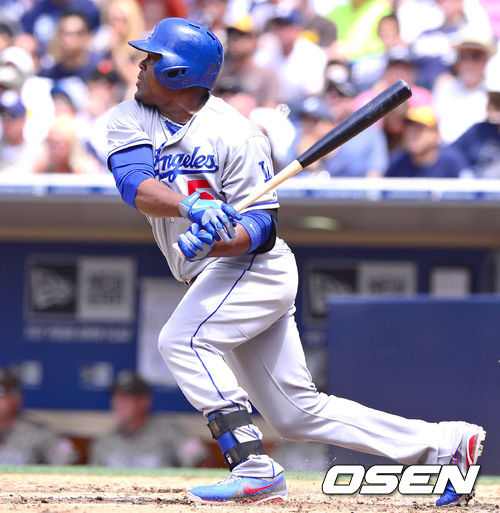 24일 새벽(한국시간) 미국 캘리포니아 샌디에이고 펫코파크에서 메이저리그 샌디에이고 파드리스와 LA 다저스의 경기, 5회초 LA 선두타자 우리베가 2루타를 날리고 있다.