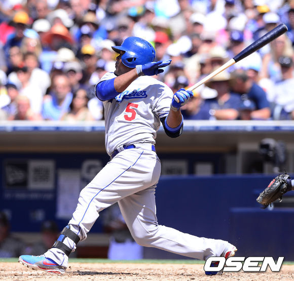 24일 새벽(한국시간) 미국 캘리포니아 샌디에이고 펫코파크에서 메이저리그 샌디에이고 파드리스와 LA 다저스의 경기,7회 2사 3루 LA 유리베가 선취 1타점 적시타를 날리고 있다.