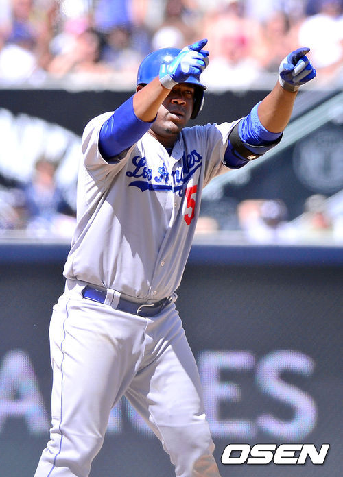 24일 새벽(한국시간) 미국 캘리포니아 샌디에이고 펫코파크에서 열린 2013 메이저리그 샌디에이고 파드리스와 LA 다저스의 경기, 7회초 2사 3루 LA 우리베가 선취 1타점 적시타를 날린후 환호하고 있다