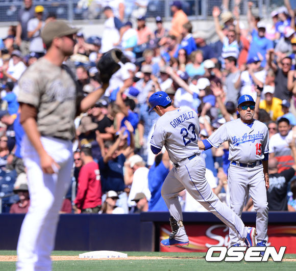 24일 새벽(한국시간) 미국 캘리포니아 샌디에이고 펫코파크에서 열린 2013 메이저리그 샌디에이고 파드리스와 LA 다저스의 경기, 9회초 1사 LA 곤살레스가 솔로홈런을 날리고 베이스를 돌고 있다.