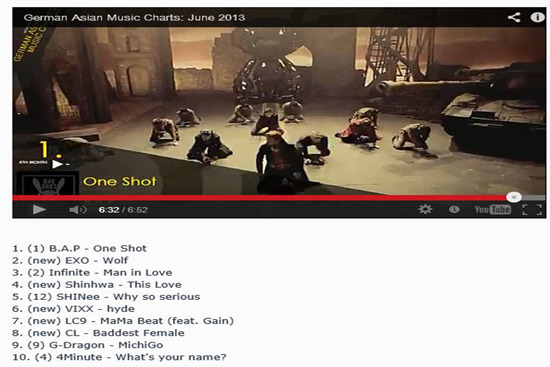 독일 현지 시간으로 지난 22일에 공개된 6월의 독일 아시안 음악 차트(German Asian Music Chart)에 따르면 B.A.P의 두 번째 미니앨범 타이틀곡인 ‘ONE SHOT’이 4개월 째 1위를 고수했으며, 지드래곤, 샤이니, 인피니트, EXO 등 현재 국내외에서 최고의 인기를 구가하고 있는 K팝 가수들이 뒤를 잇고 있어 또 한 번 독일 차트를 장악한 B.A.P의 인기가 폭발적임을 입증했다.