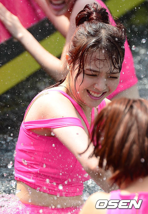 24일 오후 서울 장충동 반얀트리 호텔 야외 수영장에서 열린 걸스데이(소진,민아,유라,혜리) 쇼케이스에서 걸스데이 멤버들이 수영장에 입수하는 이벤트를 하고 있다.