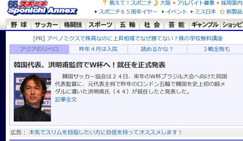 '닛칸스포츠'는 24일 한국축구협회가 전직 2002 한일 월드컵 대표 주장이자 J리그 가시와 등에서 활약한 홍명보 감독의 취임을 발표했다고 보도했다. 오후 2시 30분 현재 홍 신임감독 취임 뉴스는 종합뉴스 랭킹 5위에 올라있다.