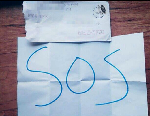 사진 속에는 편지 봉투와 편지가 보인다. A4 용지로 된 편지에는 'SOS(긴급 도움 요청)'라는 문구가 있어 웃음을 자아내고 있다.