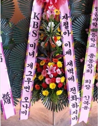 '자철아 이제 새벽에 전화하지마'라고 적힌 화환을 보낸 주인공은 다름 아닌 KBS 인기 개그우먼 오나미. 화한 옆 'KBS 미녀 개그우먼 오나미'라고 쓰여 있어 웃음을 자아낸다.