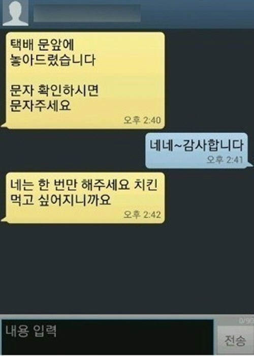 택배 수취 확인을 부탁하는 택배기사의 문자에 수취인이 "네네"라고 대답한 것이 화근. 택배기사는 수취인의 답문에 "네는 한 번만 해주세요. 치킨 먹고 싶어지니까요"라고 쿨하게 답변해 네티즌의 폭소를 자아냈다.
