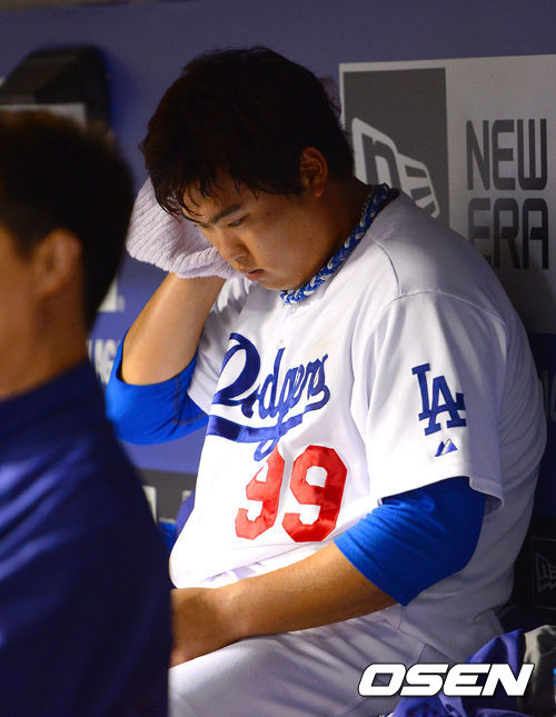 7회초 교체된 다저스 류현진이 땀을 닦고 있다 . / soul1014@osen.co.kr