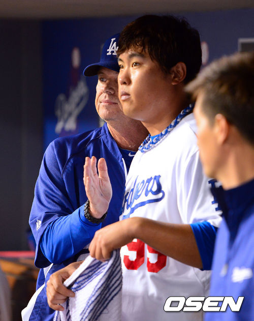 7회초 교체된 다저스 류현진이 허니컷 투수코치의 격려를 받고 있다. / soul1014@osen.co.kr