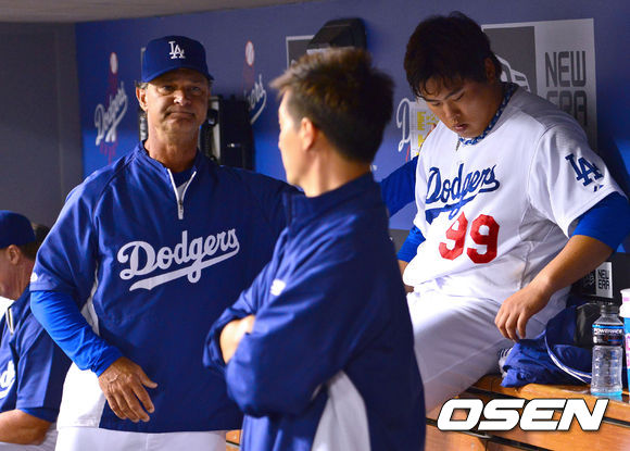 7회초 교체된 다저스 류현진이 매팅리 감독의 격려를 받고 있다 . / soul1014@osen.co.kr