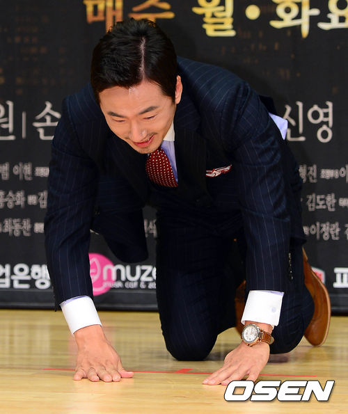 25일 오후 서울 목동 SBS사옥에서 열린 SBS대기획 '황금의 제국' 제작발표회에서 류승수가 카메라를 향해 절을 하는 퍼포먼스를 하고 있다.