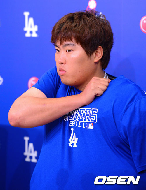 경기종료 후 기자회견에서 류현진이 어깨를 두드리고 있다./ soul1014@osen.co.kr