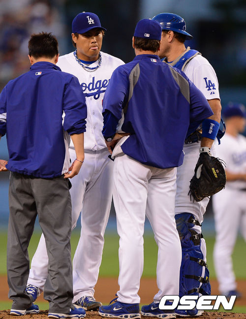 3회초 류현진이 허니컷 코치와 마운드에서 이야기를 나누고 있다 / soul1014@osen.co.kr