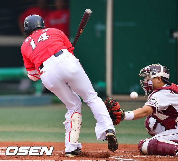 25일 오후 서울 목동구장에서 열린 2013 한국야쿠르트 세븐프로야구 넥센 히어로즈와 SK 와이번스의 경기, 1회초 무사 주자 1,3루 SK 최정이 넥센 선발 김병현이 던진 볼에 맞고 있다.