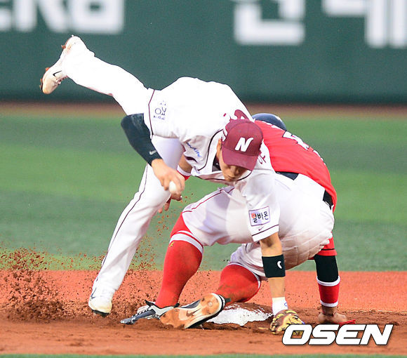 25일 오후 서울 목동구장에서 열린 2013 한국야쿠르트 세븐프로야구 넥센 히어로즈와 SK 와이번스의 경기, 2회초 무사 주자 1루 SK 정근우의 3루수 앞 땅볼때 넥센 2루수 유재신이 2루에서 조인성을 포스아웃 시킨 후 1루로 송구하려 할때 조인성과 충돌하고 있다.