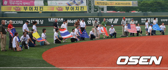 25일 오후 서울 목동구장에서 열린 2013 한국야쿠르트 세븐프로야구 넥센 히어로즈와 SK 와이번스의 경기, 경기 전 6.25 한국전쟁 60주년을 맞이해 한국전쟁에 참전했던 각국의 전쟁영웅들과 그 후손들이 각국국기를 들고 입장하고 있다.
