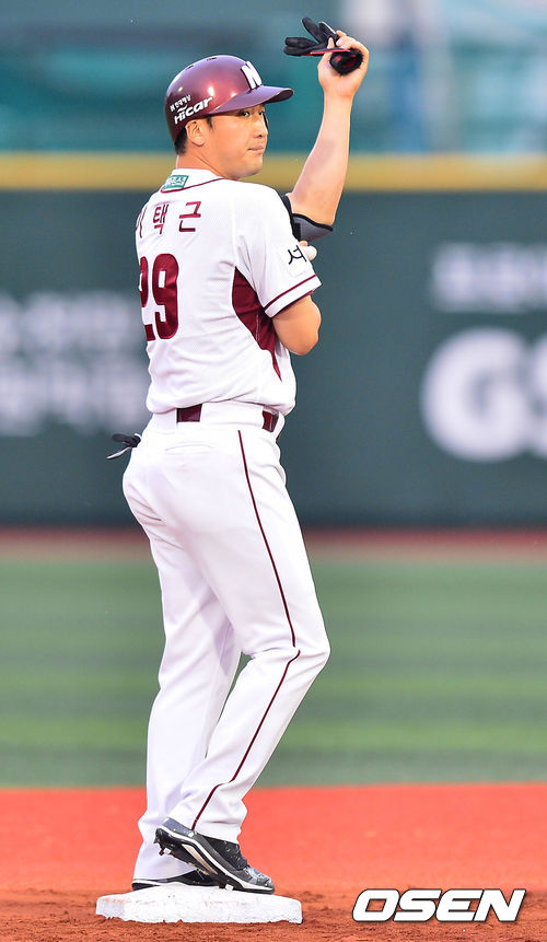 25일 오후 서울 목동구장에서 열린 2013 한국야쿠르트 세븐프로야구 넥센 히어로즈와 SK 와이번스의 경기, 1회 1사 1루에서 넥센 이택근이 레이예스로부터 좌익수 왼쪽에 떨어지는 2루타를 날린 후 2루에서 기뻐하고 있다. 이로써 이택근은 역대 65번째로 개인 통산 1000번째 안타를 달성한 선수가 됐다.