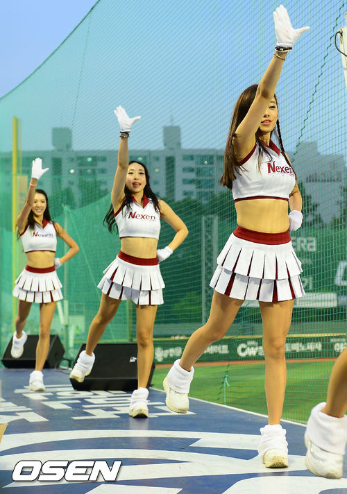 25일 오후 서울 목동구장에서 열린 2013 한국야쿠르트 세븐프로야구 넥센 히어로즈와 SK 와이번스의 경기, 넥센 치어리더들이 무대 위에서 화려한 공연을 펼치고 있다.