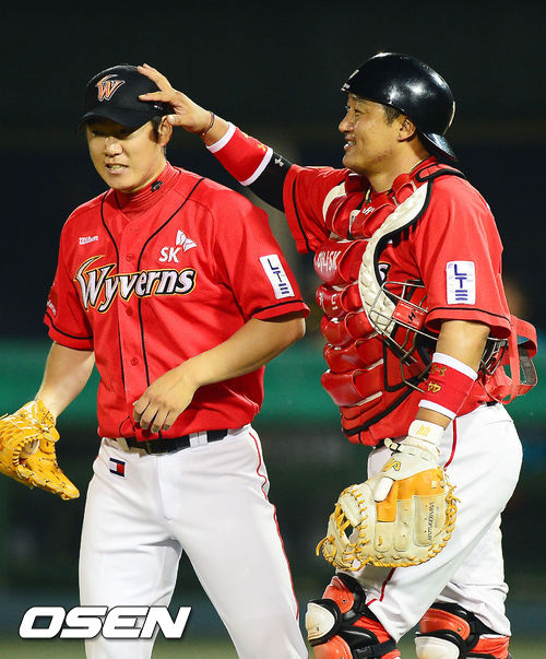 경기를 마치고 SK 박희수와 조인성이 기쁨을 나누고 있다. / rumi@osen.co.kr