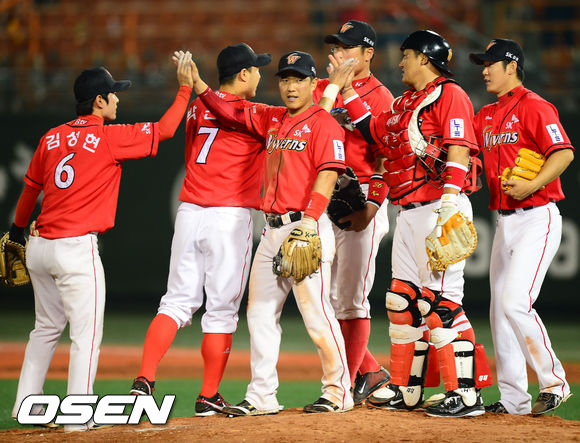경기를 마치고 SK 선수들이 마운드 근처에 모여서 하이파이브를 하고 있다. / rumi@osen.co.kr