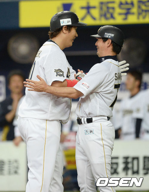 이대호가 홈인후 사다키 코치의 환영을 받고 있다./ youngrae@osen.co.kr