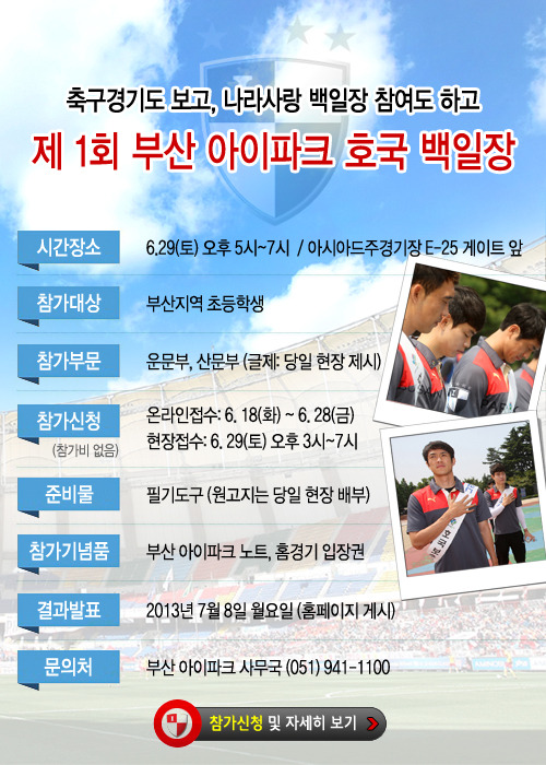 호국보훈의 달의 뜻을 기리기 위한 ‘제 1회 부산 아이파크 호국 백일장’에 참가를 희망하는 가족은 인터넷 홈페이지 www.busanipark.com 을 통해 신청 접수 가능하며, 경기당일 아시아드 경기장 입장 게이트 앞에서 현장 접수도 가능하다. 또한 백일장 참가자 전원에게는 구단에서 제공하는 특별 기념품이 제공될 예정이다.