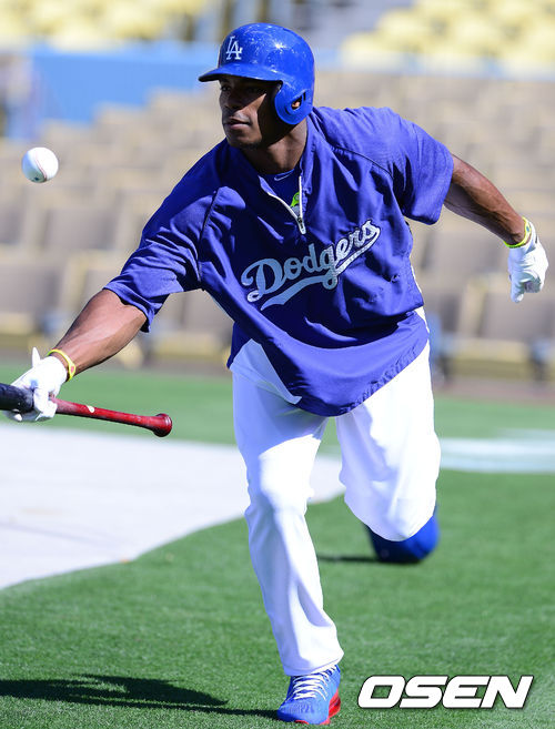 [OSEN=로스앤젤레스, 곽영래 기자] 26일(한국시간) 미국 캘리포니아주 로스앤젤레스 다저스 스타디움에서 열린 2013 미국 메이저리그 LA 다저스와 샌프란시스코 자이언츠의 경기, 경기에 앞서 다저스 푸이그가 공 토스놀이를 하고 있다