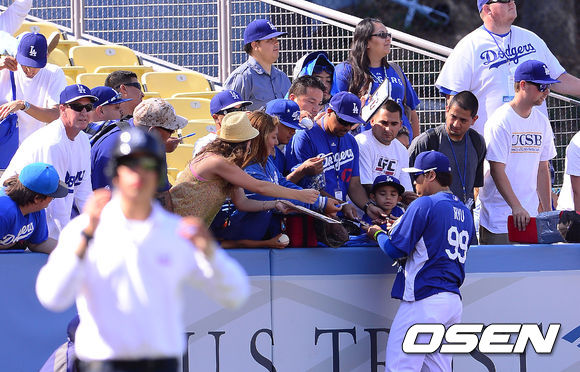 [OSEN=로스앤젤레스, 곽영래 기자] 26일(한국시간) 미국 캘리포니아주 로스앤젤레스 다저스 스타디움에서 열린 2013 미국 메이저리그 LA 다저스와 샌프란시스코 자이언츠의 경기, 경기에 앞서 다저스 류현진이 팬들에게 사인을 해주고 있다