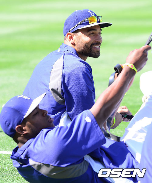 [OSEN=로스앤젤레스, 곽영래 기자] 26일(한국시간) 미국 캘리포니아주 로스앤젤레스 다저스타디움에서 열린 2013 미국 메이저리그 LA 다저스와 샌프란시스코 자이언츠의 경기에 앞서 다저스 맷 켐프가 스트레칭 중 미소 짓고 있다. 켐프는 이날 중견수 5번으로 선발출전한다.