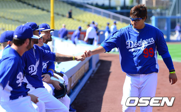 [OSEN=로스앤젤레스, 곽영래 기자] 26일(한국시간) 미국 캘리포니아주 로스앤젤레스 다저스타디움에서 열린 2013 미국 메이저리그 LA 다저스와 샌프란시스코 자이언츠의 경기에 앞서 다저스 류현진이 부상복귀한 멧 켐프와 하이파이브를 하고 있다
