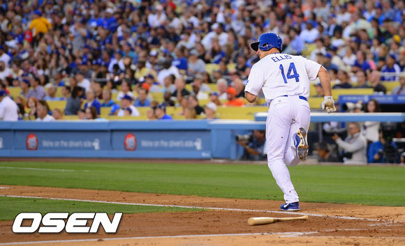 [OSEN=로스앤젤레스, 곽영래 기자] 26일(한국시간) 미국 캘리포니아주 로스앤젤레스 다저스타디움에서 열린 2013 미국 메이저리그 LA 다저스와 샌프란시스코 자이언츠의 경기, 3회말 1사 2루 다저스 마크 엘리스가 선취 2점 홈런을 날리고 타구를 바라보고 있다