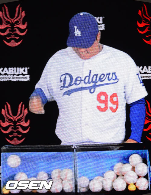 [OSEN=로스앤젤레스, 곽영래 기자] 26일(한국시간) 미국 캘리포니아주 로스앤젤레스 다저스타디움에서 열린 2013 미국 메이저리그 LA 다저스와 샌프란시스코 자이언츠의 경기, 4회말 종료 후 다저스 스타디움 전광판에 등장한 류현진이 야구공 젓가락으로 옮기기 이벤트에서 57점을 기록했다.