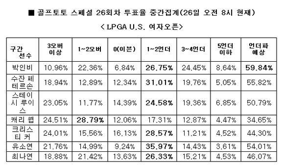 반면 34.65%의 언더파 지지율을 보인 캐리 웹을 비롯해, 크리스티 커(44.30%), 최나연(46.07%)등은 언더파 확률이 절반을 넘지 못하는 부진한 투표율을 보였다. 지정 선수별 1라운드 예상 스코어에서는 1~2오버파가 1순위를 차지한 캐리 웹을 제외한 모든 선수가 1~2언더파의 준수한 성적을 기록할 것으로 나타났다.