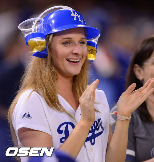 다저스 여성팬이 헬멧에 맥주잔을 달고 열띤 응원을 펼치고 있다 / soul1014@osen.co.kr