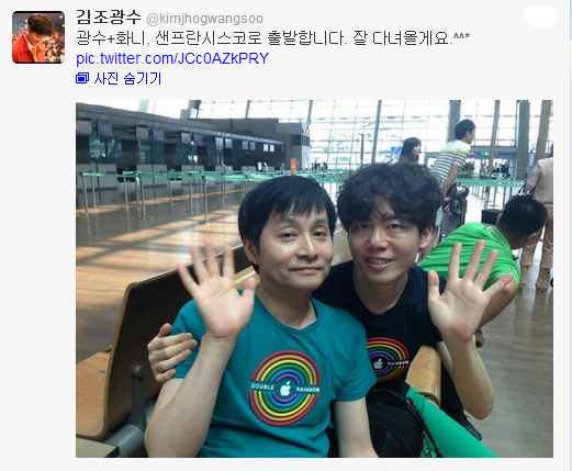 김조광수 감독은 이날 오후 자신의 트위터를 통해 "광수+화니, 샌프란시스코로 출발합니다. 잘 다녀올게요.^^*"라는 글과 함께 사진 한 장을 올렸다. 사진 속에는 김조광수 감독이 김 대표에게 살짝 기댄 채 정답게 앉아 손을 흔들고 있는 모습이 담겨있다. 특히 둘은 옷을 커플티로 맞춰 입은 채 행복한 미소를 짓고 있다.