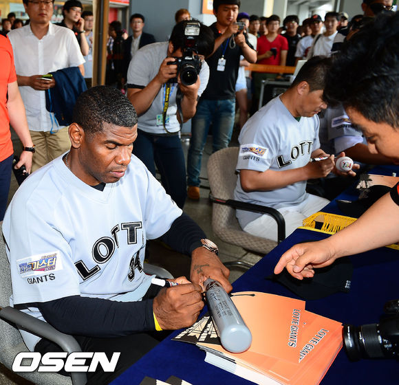 26일 오후 부산 사직구장에서 2013 한국야쿠르트 세븐프로야구 롯데 자이언츠와 NC 다이노스의 경기가 열릴 예정인 가운데 경기 전 호세가 배트에 사인을 해주고 있다.