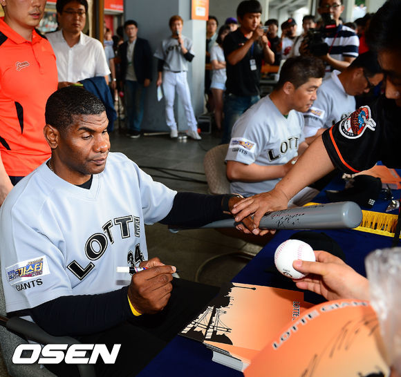 26일 오후 부산 사직구장에서 2013 한국야쿠르트 세븐프로야구 롯데 자이언츠와 NC 다이노스의 경기가 열릴 예정인 가운데 경기 전 호세가 배트에 사인을 해주고 있다.
