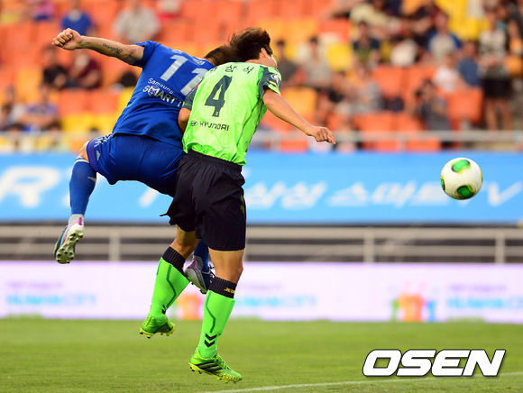 26일 오후 수원 월드컵경기장에서 열린 '2013 현대오일뱅크 K리그 클래식' 수원 삼성과 전북 현대의 경기 전반 수원 스테보가 헤딩골을 넣고 있다.