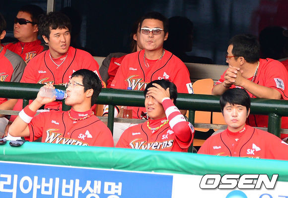 26일 오후 서울 목동야구장에서 열린 '2013 한국야쿠르트 세븐 프로야구' 넥센 히어로즈와 SK 와이번스의 경기, 1회초 허벅지 통증으로 선발에서 제외된 SK 최정이 더그아웃에서 동료선수들과 이야기를 나누고 있다. 최정은 전날 경기에서 넥센 선발 김볌현의 투구에 허벅지를 맞았다.