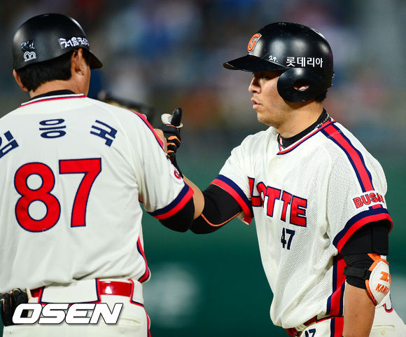 26일 오후 부산 사직구장에서 열린 2013 한국야쿠르트 세븐프로야구 롯데 자이언츠와 NC 다이노스의 경기, 5회말 2사 주자 1,3루 롯데 강민호가 좌익수 앞 1타점 동점 적시타를 날린 후 1루에서 김응국 코치와 하이파이브를 하고 있다.