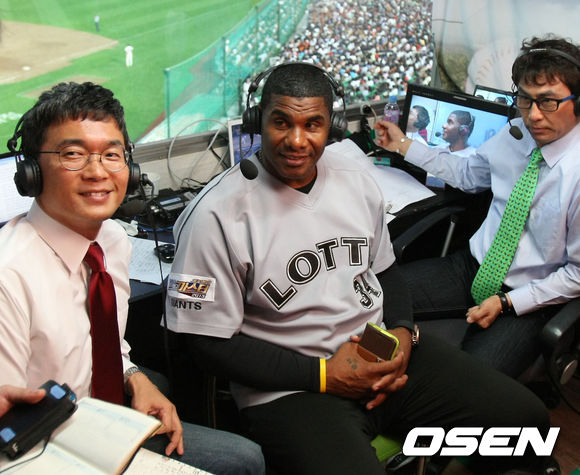 26일 오후 부산 사직구장에서 열린 2013 한국야쿠르트 세븐프로야구 롯데 자이언츠와 NC 다이노스의 경기, 펠릭스 호세가 1루 중계부스에서 KBSN 스포츠 객원 해설을 하고 있다.