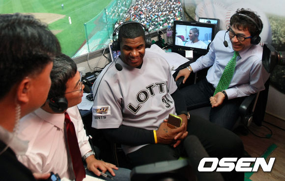 26일 오후 부산 사직구장에서 열린 2013 한국야쿠르트 세븐프로야구 롯데 자이언츠와 NC 다이노스의 경기, 펠릭스 호세가 1루 중계부스에서 KBSN 스포츠 객원 해설을 하고 있다.
