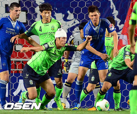 26일 오후 수원 월드컵경기장에서 열린 '2013 현대오일뱅크 K리그 클래식' 수원 삼성과 전북 현대의 경기 후반 정인환이 붕대를 머리에 감싼 채 볼다툼을 하고 있다.