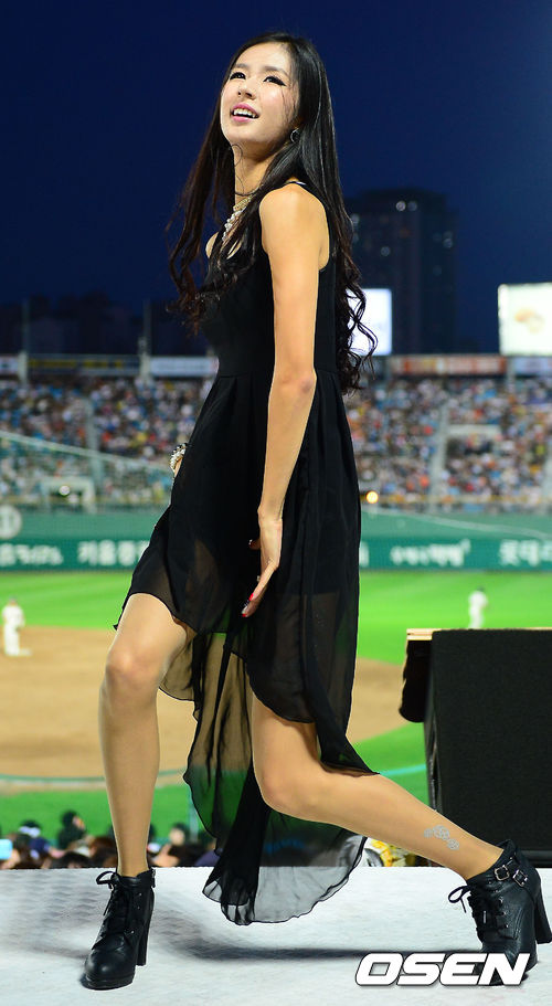 26일 오후 부산 사직구장에서 열린 2013 한국야쿠르트 세븐프로야구 롯데 자이언츠와 NC 다이노스의 경기, 롯데 치어리더 박기량이 무대 위에서 박지윤의 성인성에 맞춰 특별 공연을 펼치고 있다.