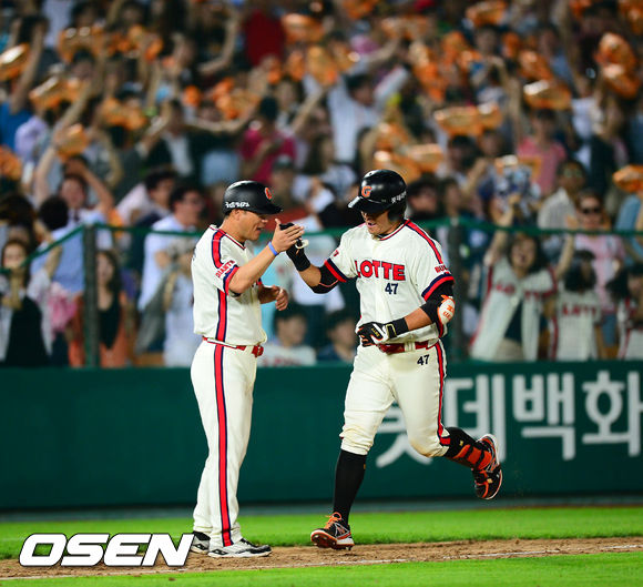 26일 오후 부산 사직구장에서 열린 2013 한국야쿠르트 세븐프로야구 롯데 자이언츠와 NC 다이노스의 경기, 8회말 1사 롯데 강민호가 역전 우월 솔로 홈런을 날린 후 그라운드를 돌고 있다.