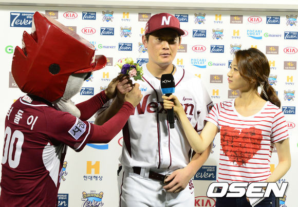 경기후 넥센 이성열의 히어로 인터뷰에 턱돌이가 꽃을 선물하고 있다./ jpnews@osen.co.kr