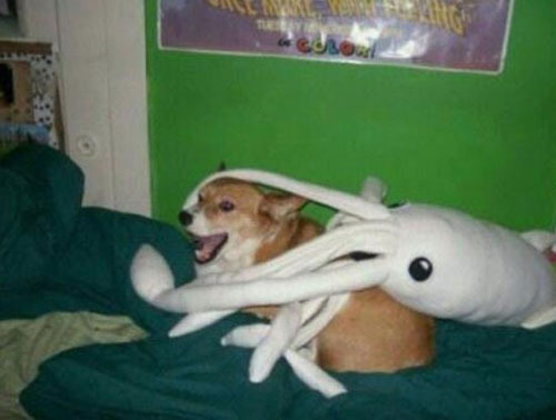 사진 속에는 오징어 인형의 다리에 파묻힌 강아지가 황당하고 겁먹은 표정을 짓고 있다. 마치 오징어가 다리로 강아지를 잡아서 집어삼키려는 듯한 모습이다.